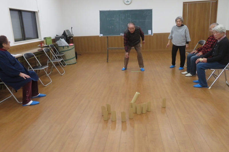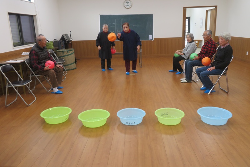 1月20日(火)西吉木公民館で開催された西吉木いきいきサロンにお邪魔しましたガンバルーン(やわらかいゴムのボール)を使って体操と脳トレを行いました。2チームに分かれてガンバルーンでゲームを2つ、そのあとモルックをして楽しみました